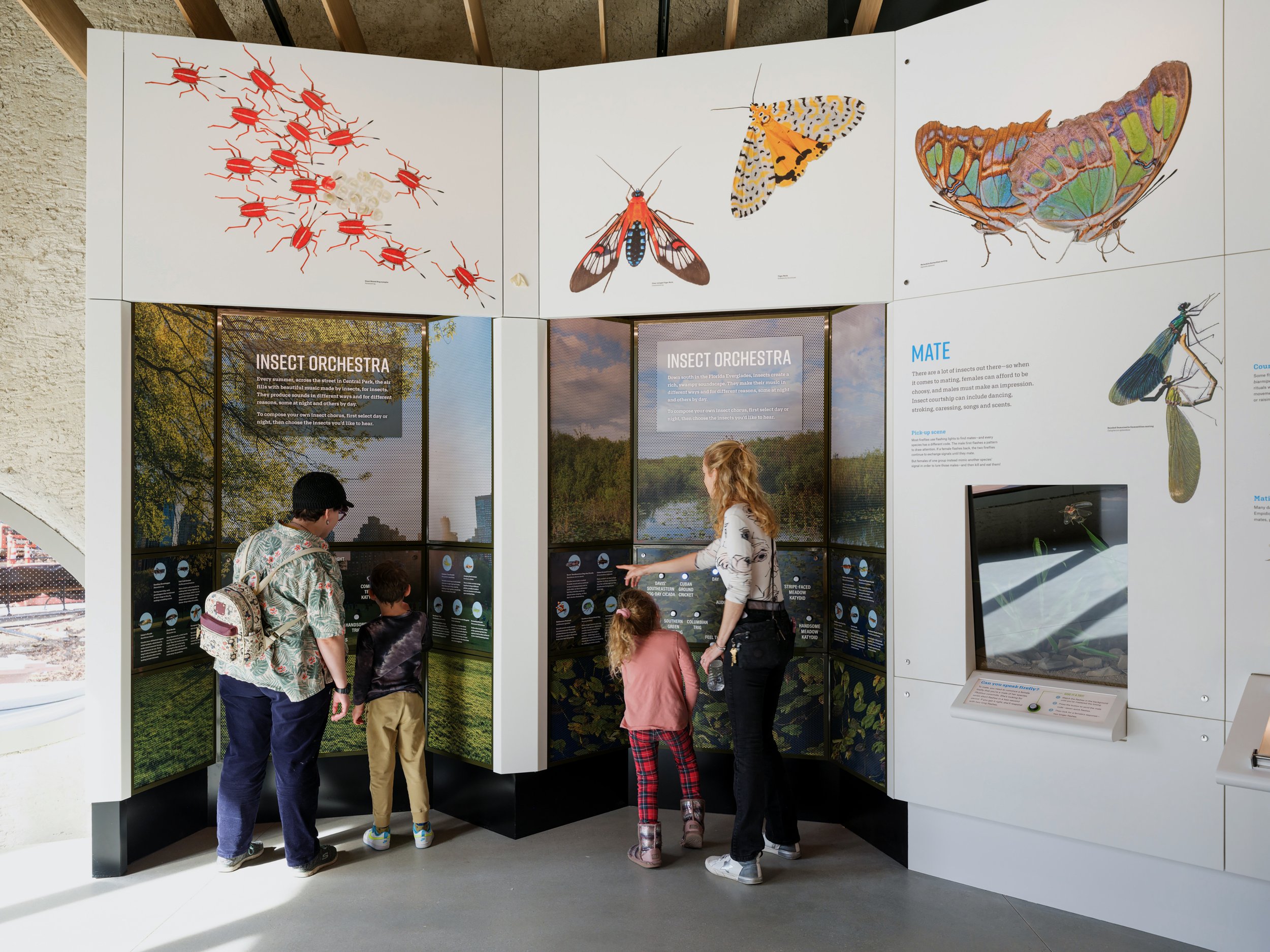 One of the goals of the Insectarium is to help visitors of all ages to see insects in a new way. The common reaction to insects is disgust or fear—of decay, infestation, and the unknown. In the Insectarium, the graphics and storytelling are welcoming, humorous, and strive to create a feeling of wonder and beauty. Many species hide in plain sight or are so small that we cannot see them, but their lives are complex and their role in our own ecosystem is vital.